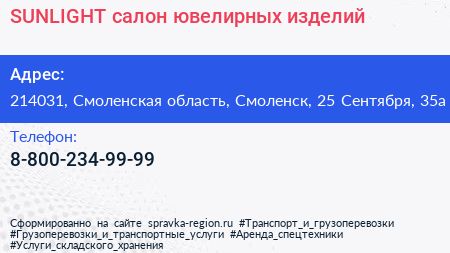 SUNLIGHT, салон ювелирных изделий по адресу 214031, Смоленская область, Смоленск, 25 Сентября, 35а в дальнейшем Организация, размещена в следующих категориях: