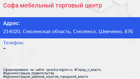 Софа, мебельный торговый центр по адресу 214020, Смоленская область, Смоленск, Шевченко, 87Б в дальнейшем Организация, размещена в следующих категориях: