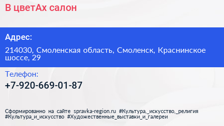В цветАх, салон по адресу 214030, Смоленская область, Смоленск, Краснинское шоссе, 29 в дальнейшем Организация, размещена в следующих категориях: