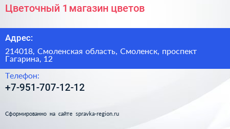 Цветочный №1, магазин цветов по адресу 214018, Смоленская область, Смоленск, проспект Гагарина, 12 в дальнейшем Организация, размещена в следующих категориях: