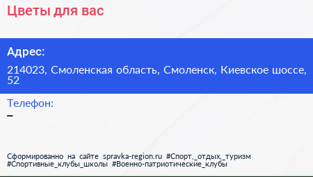 Цветы для вас по адресу 214023, Смоленская область, Смоленск, Киевское шоссе, 52 в дальнейшем Организация, размещена в следующих категориях: