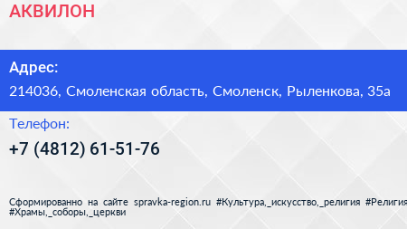 АКВИЛОН по адресу 214036, Смоленская область, Смоленск, Рыленкова, 35а в дальнейшем Организация, размещена в следующих категориях: