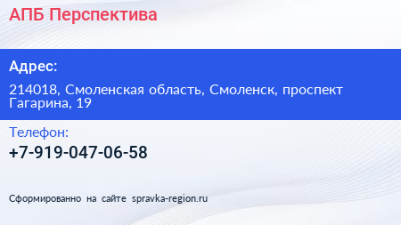 АПБ Перспектива по адресу 214018, Смоленская область, Смоленск, проспект Гагарина, 19 в дальнейшем Организация, размещена в следующих категориях: