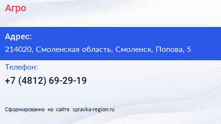 Агро по адресу 214020, Смоленская область, Смоленск, Попова, 5 в дальнейшем Организация, размещена в следующих категориях: