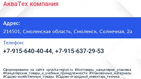 АкваТех, компания по адресу 214501, Смоленская область, Смоленск, Солнечная, 2а в дальнейшем Организация, размещена в следующих категориях: