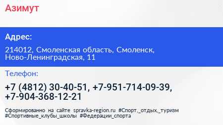 Азимут по адресу 214012, Смоленская область, Смоленск, Ново-Ленинградская, 11 в дальнейшем Организация, размещена в следующих категориях: