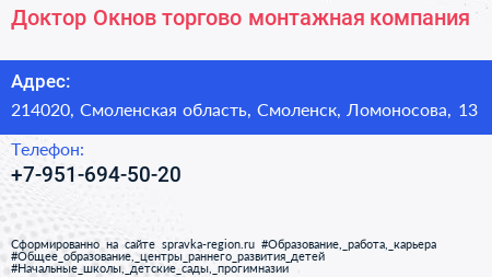 Доктор Окнов, торгово-монтажная компания по адресу 214020, Смоленская область, Смоленск, Ломоносова, 13 в дальнейшем Организация, размещена в следующих категориях: