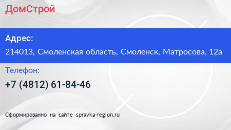 ДомСтрой по адресу 214013, Смоленская область, Смоленск, Матросова, 12а в дальнейшем Организация, размещена в следующих категориях: