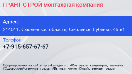 ГРАНТ СТРОЙ, монтажная компания по адресу 214011, Смоленская область, Смоленск, Губенко, 46 к1 в дальнейшем Организация, размещена в следующих категориях: