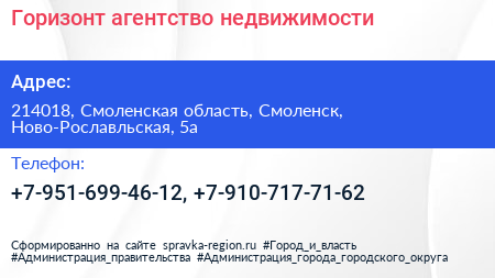 Горизонт, агентство недвижимости по адресу 214018, Смоленская область, Смоленск, Ново-Рославльская, 5а в дальнейшем Организация, размещена в следующих категориях: