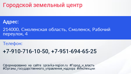 Городской земельный центр по адресу 214000, Смоленская область, Смоленск, Рабочий переулок, 4 в дальнейшем Организация, размещена в следующих категориях: