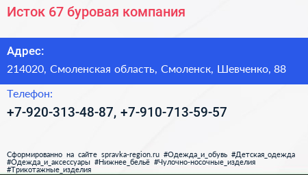 Исток 67, буровая компания по адресу 214020, Смоленская область, Смоленск, Шевченко, 88 в дальнейшем Организация, размещена в следующих категориях:
