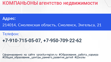 КОМПАНЬОНЫ, агентство недвижимости по адресу 214014, Смоленская область, Смоленск, Энгельса, 21 в дальнейшем Организация, размещена в следующих категориях: