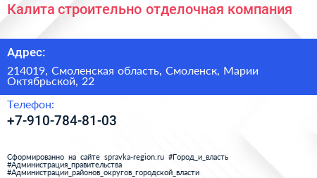 Калита, строительно-отделочная компания по адресу 214019, Смоленская область, Смоленск, Марии Октябрьской, 22 в дальнейшем Организация, размещена в следующих категориях: