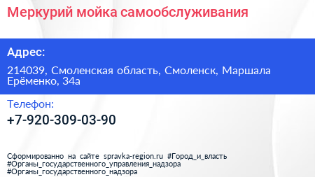 Меркурий, мойка самообслуживания по адресу 214039, Смоленская область, Смоленск, Маршала Ерёменко, 34а в дальнейшем Организация, размещена в следующих категориях: