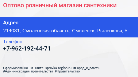 Оптово-розничный магазин сантехники по адресу 214031, Смоленская область, Смоленск, Рыленкова, 6 в дальнейшем Организация, размещена в следующих категориях: