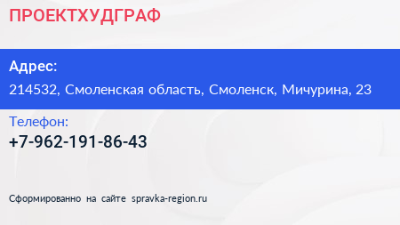 ПРОЕКТХУДГРАФ по адресу 214532, Смоленская область, Смоленск, Мичурина, 23 в дальнейшем Организация, размещена в следующих категориях: