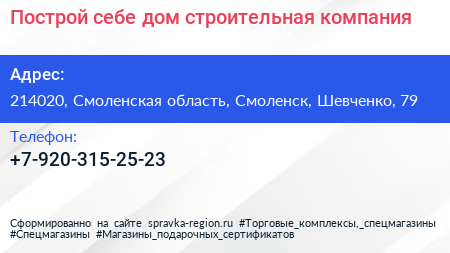 Построй себе дом, строительная компания по адресу 214020, Смоленская область, Смоленск, Шевченко, 79 в дальнейшем Организация, размещена в следующих категориях:
