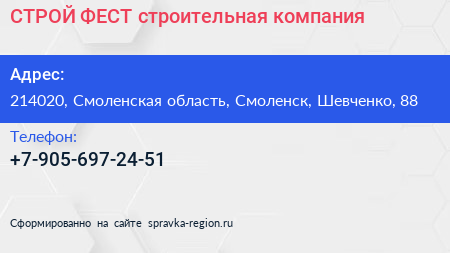 СТРОЙ ФЕСТ, строительная компания по адресу 214020, Смоленская область, Смоленск, Шевченко, 88 в дальнейшем Организация, размещена в следующих категориях: