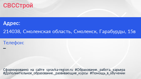 СВССтрой по адресу 214038, Смоленская область, Смоленск, Гарабурды, 15в в дальнейшем Организация, размещена в следующих категориях: