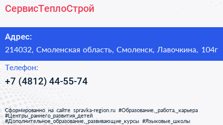 СервисТеплоСтрой по адресу 214032, Смоленская область, Смоленск, Лавочкина, 104г в дальнейшем Организация, размещена в следующих категориях:
