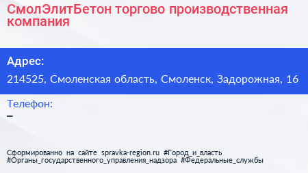 СмолЭлитБетон, торгово-производственная компания по адресу 214525, Смоленская область, Смоленск, Задорожная, 16 в дальнейшем Организация, размещена в следующих категориях: