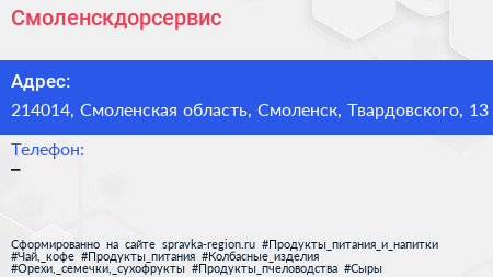Смоленскдорсервис по адресу 214014, Смоленская область, Смоленск, Твардовского, 13 в дальнейшем Организация, размещена в следующих категориях: