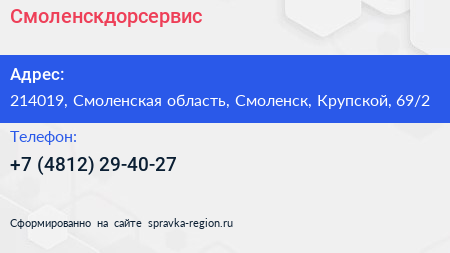 Смоленскдорсервис по адресу 214019, Смоленская область, Смоленск, Крупской, 69/2 в дальнейшем Организация, размещена в следующих категориях:
