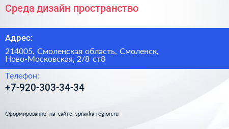 Среда, дизайн-пространство по адресу 214005, Смоленская область, Смоленск, Ново-Московская, 2/8 ст8 в дальнейшем Организация, размещена в следующих категориях: