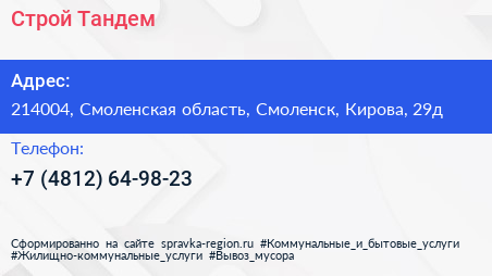 Строй-Тандем по адресу 214004, Смоленская область, Смоленск, Кирова, 29д в дальнейшем Организация, размещена в следующих категориях: