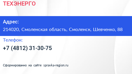 ТЕХЭНЕРГО по адресу 214020, Смоленская область, Смоленск, Шевченко, 88 в дальнейшем Организация, размещена в следующих категориях: