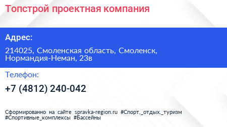 Топстрой, проектная компания по адресу 214025, Смоленская область, Смоленск, Нормандия-Неман, 23в в дальнейшем Организация, размещена в следующих категориях: