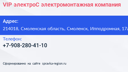 VIP-электроС, электромонтажная компания по адресу 214018, Смоленская область, Смоленск, Ипподромная, 17а в дальнейшем Организация, размещена в следующих категориях: