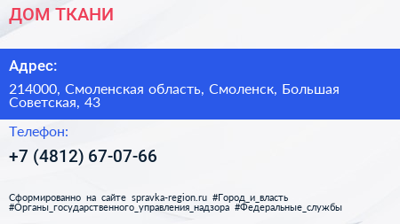 ДОМ ТКАНИ по адресу 214000, Смоленская область, Смоленск, Большая Советская, 43 в дальнейшем Организация, размещена в следующих категориях:
