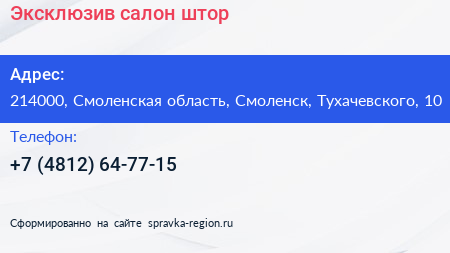 Эксклюзив, салон штор по адресу 214000, Смоленская область, Смоленск, Тухачевского, 10 в дальнейшем Организация, размещена в следующих категориях: