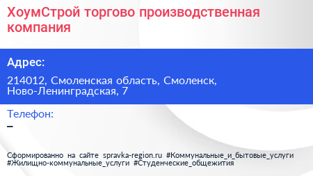 ХоумСтрой, торгово-производственная компания по адресу 214012, Смоленская область, Смоленск, Ново-Ленинградская, 7 в дальнейшем Организация, размещена в следующих категориях: