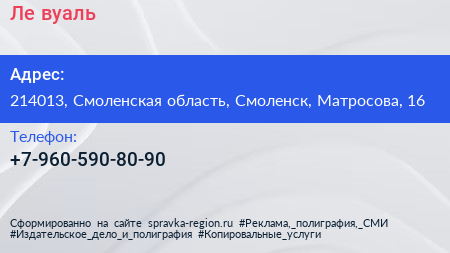 Ле`вуаль по адресу 214013, Смоленская область, Смоленск, Матросова, 16 в дальнейшем Организация, размещена в следующих категориях: