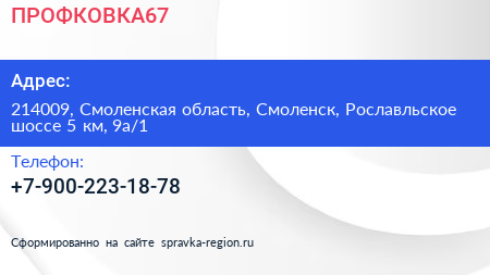 ПРОФКОВКА67 по адресу 214009, Смоленская область, Смоленск, Рославльское шоссе 5 км, 9а/1 в дальнейшем Организация, размещена в следующих категориях:
