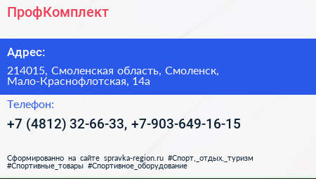ПрофКомплект по адресу 214015, Смоленская область, Смоленск, Мало-Краснофлотская, 14а в дальнейшем Организация, размещена в следующих категориях: