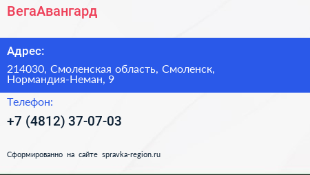 ВегаАвангард по адресу 214030, Смоленская область, Смоленск, Нормандия-Неман, 9 в дальнейшем Организация, размещена в следующих категориях: