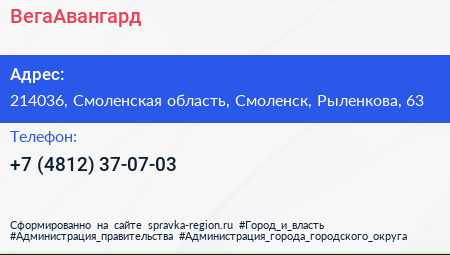 ВегаАвангард по адресу 214036, Смоленская область, Смоленск, Рыленкова, 63 в дальнейшем Организация, размещена в следующих категориях: