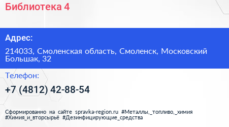 Библиотека №4 по адресу 214033, Смоленская область, Смоленск, Московский Большак, 32 в дальнейшем Организация, размещена в следующих категориях: