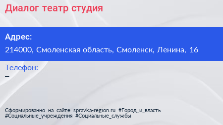 Диалог, театр-студия по адресу 214000, Смоленская область, Смоленск, Ленина, 16 в дальнейшем Организация, размещена в следующих категориях:
