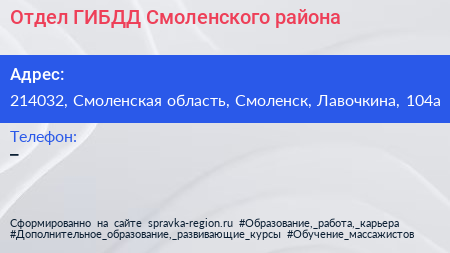 Отдел ГИБДД Смоленского района по адресу 214032, Смоленская область, Смоленск, Лавочкина, 104а в дальнейшем Организация, размещена в следующих категориях: