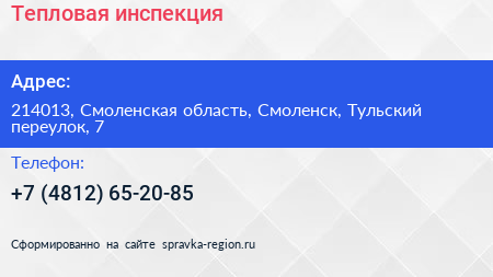 Тепловая инспекция по адресу 214013, Смоленская область, Смоленск, Тульский переулок, 7 в дальнейшем Организация, размещена в следующих категориях: