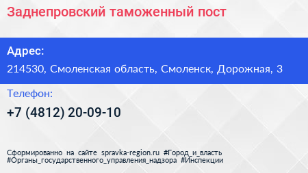 Заднепровский таможенный пост по адресу 214530, Смоленская область, Смоленск, Дорожная, 3 в дальнейшем Организация, размещена в следующих категориях: