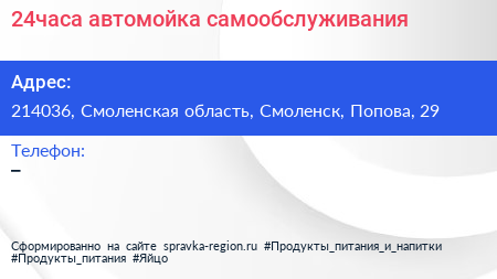 24часа, автомойка самообслуживания по адресу 214036, Смоленская область, Смоленск, Попова, 29 в дальнейшем Организация, размещена в следующих категориях: