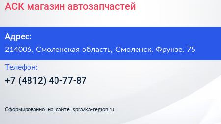 АСК, магазин автозапчастей по адресу 214006, Смоленская область, Смоленск, Фрунзе, 75 в дальнейшем Организация, размещена в следующих категориях: