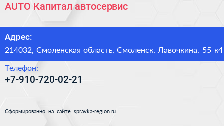 AUTO-Капитал, автосервис по адресу 214032, Смоленская область, Смоленск, Лавочкина, 55 к4 в дальнейшем Организация, размещена в следующих категориях: