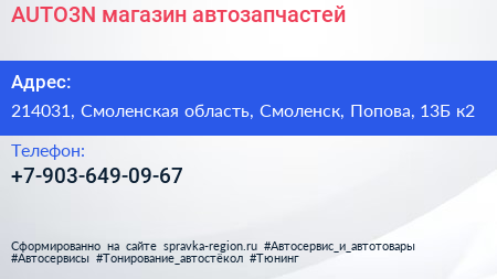 AUTO3N, магазин автозапчастей по адресу 214031, Смоленская область, Смоленск, Попова, 13Б к2 в дальнейшем Организация, размещена в следующих категориях: